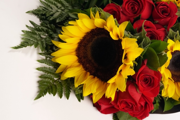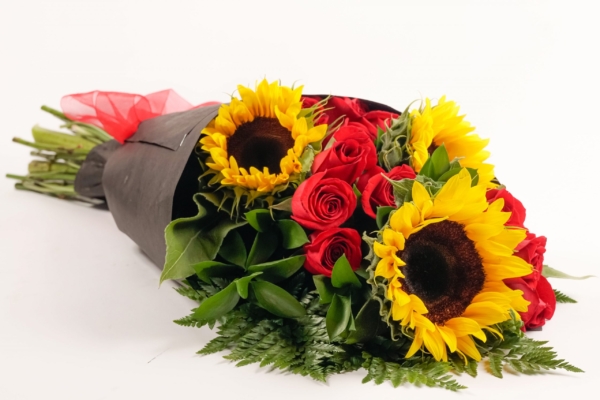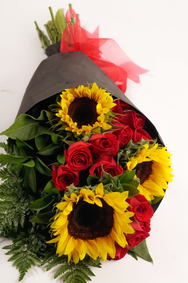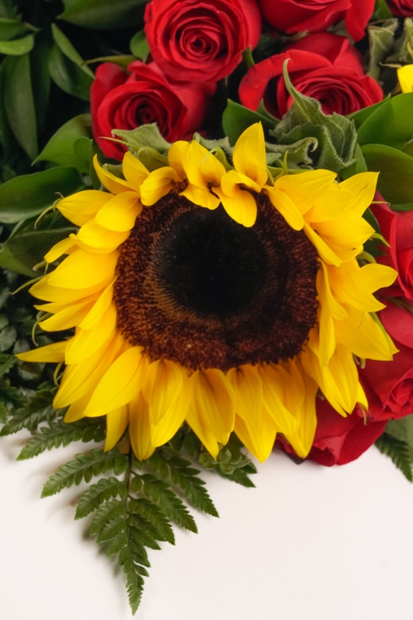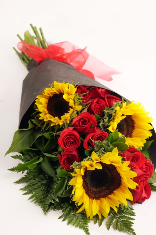 Hermoso ramo de 3 girasoles combinados con 15 rosas rojas que resaltan su belleza en combinación con elegantes helechos, ideal para cualquier ocasión y regalar una sonrisa a esa persona tan especial.