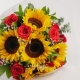 Hermoso ramo de girasoles combinados con rosas rojas que resaltan su belleza en combinación con elegantes helechos, ideal para cualquier ocasión y regalar una sonrisa a esa persona tan especial.